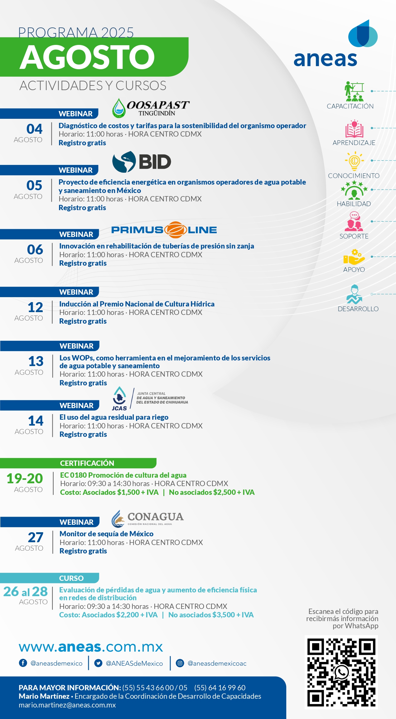 La Asociación Nacional de Entidades de Agua y Saneamiento de México, A.C., (ANEAS), consciente de los grandes retos que los organismos operadores de agua en México enfrentan; entre ellos, brindar un servicio eficiente y de calidad a sus usuarios, y sabedora que la formación de recursos humanos es la mejor inversión que se puede hacer para contribuir a elevar la calidad del servicio, contribuye al desarrollo de las capacidades del personal de dichos organismos.